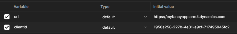 clientid,urlof your resource and any other variables you might need in your requests. Your environment would look like the following screenshot. In this case I am using the well known client ID of Azure PowerShell. I recommend you create your own app registration in Azure.