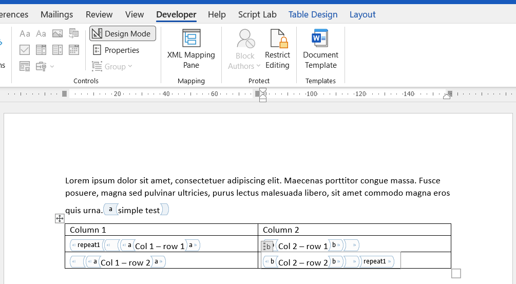 }The given JSON file can match the following word document, with a simple placeholder called "a" and a repeating section called "repeat1".