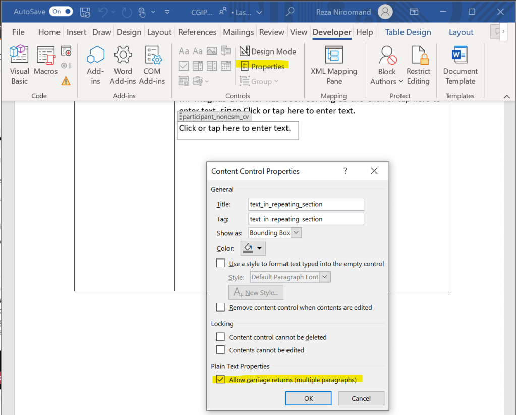 Often times you would need a repeating section in a repeating section. Imagine if you need to produce a list of accounts and their contacts. In your word document you can easily add repeating section to other repeating sections (e.g. hierarchical bullet points) but the Power Automate action does not support them. The only workaround is to use a simple Plain Text Content Control to your repeating section and enable Allow carriage returns (multiple paragraphs) and insert multiple lines of texts in it.
