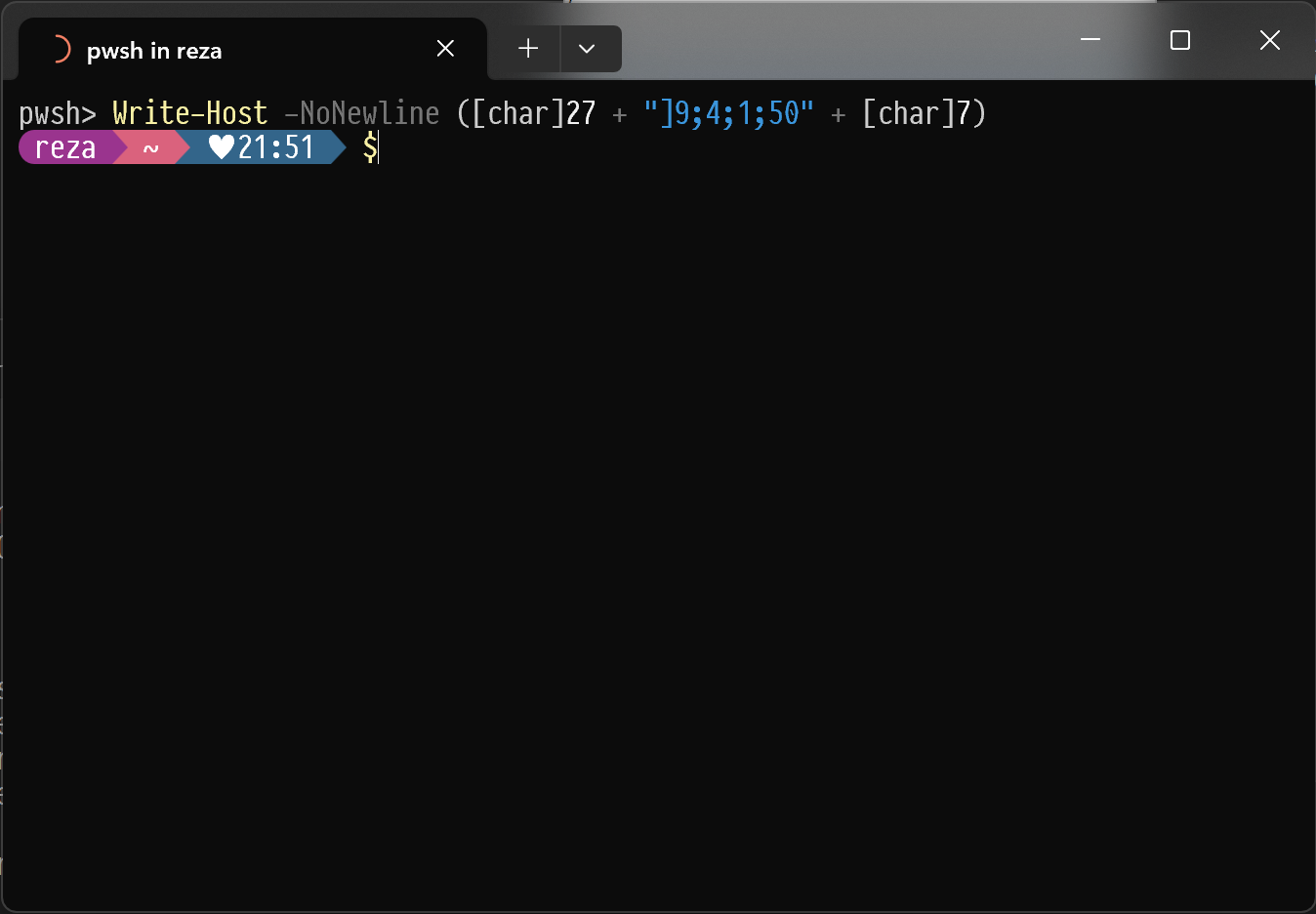 Write-Host -NoNewLine ([char]27 + "9;4;1;50" [char]7)