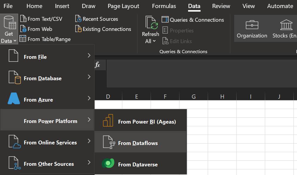 If you choose to export to your own Datalake, I assume you already know where to find the exported data. Just look for a folder with the same name as your dataflow. But you have not linked any Datalake to your environment you can still access your data. The easiest way is to use Excel.have already linked your Datalake to your Power Platform environment. You just need to go to the Data tab, then Get Data, From Power Platform, From Dataflows, like the screenshot below.