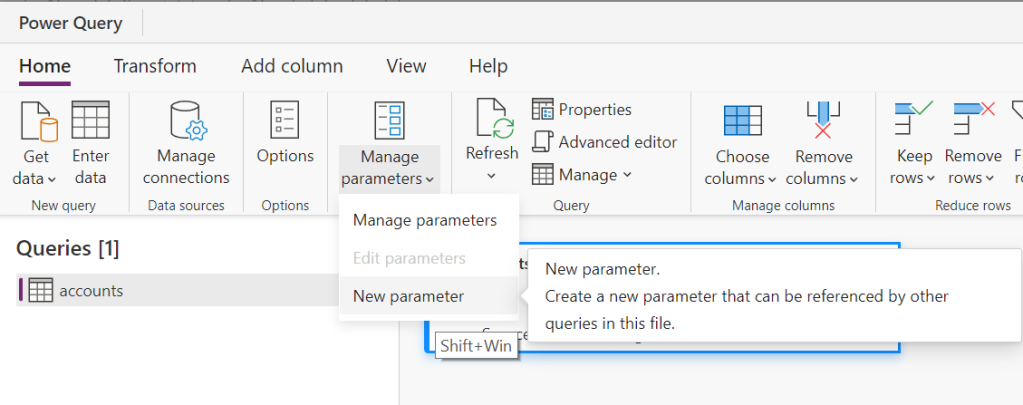 // The rest of your transformations here.in #"The last step"To make the above query parametric we first need to create two parameters. From Home tab in the ribbon, Open the "Manage parameters" and select "New parameter.