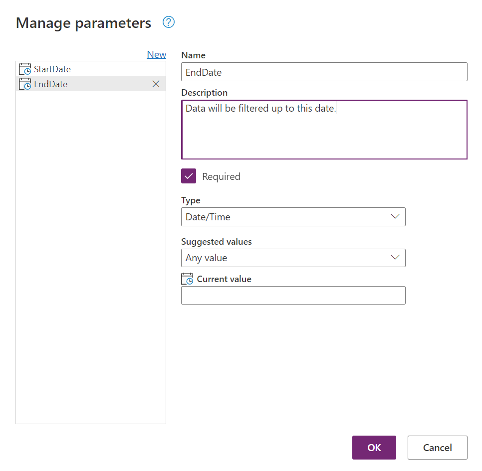 Create two new Date/Time parameters named StartDate and EndDate. The result will look like the following screenshot.