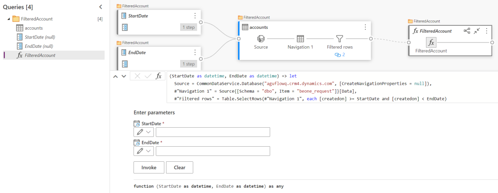 FilteredAccount(#datetime(2023,1,1,0,0,0), #datetime(2023,1,15,0,0,0))You will need to give each query a name and at the end, you will need to write an extra query to combine them all. The combining part can also be done in a different dataflow, or in the Excel if you are going to use that to download the result.
