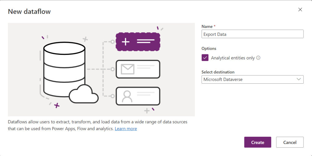 You might have overlooked this, but Dataflows can also export data. When you create a dataflow, right in the beginning you need to provide a name and decide whether your dataflow is going to import data or export data. In fact when your select the checkbox "Analytical entities only", your dataflow will export data. The destination of the export will be the managed Datalake of your Power Platform environment by default, but you can also export to any Datalake linked to your Power Platform environment. You just need to choose it from the "Select destination" dropdown list.