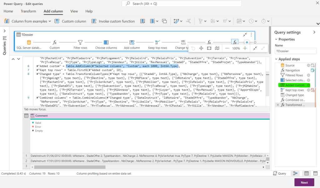 Table.AddColumn(#"Selected columns", "Custom", each 1000, Int64.Type)And voila: